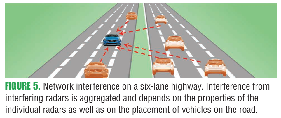 图5内容解读:受害车位于某条车道,周围多车道(对向、同向超车道等)车辆均可能形成干扰;作者将来自不同车道的干扰叠加,强调它与车辆空间分布、天线视场(FOV)等密切相关。