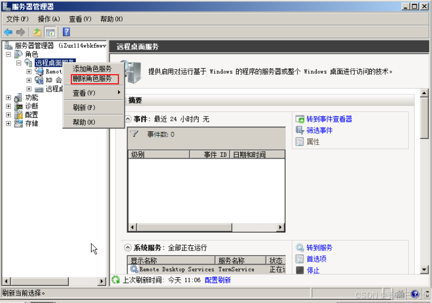 2.打开"服务器管理器",依次选择"角色 > 远程桌面服务 ",右键单击"远程桌面服务",然后选择"删除角色服务"。