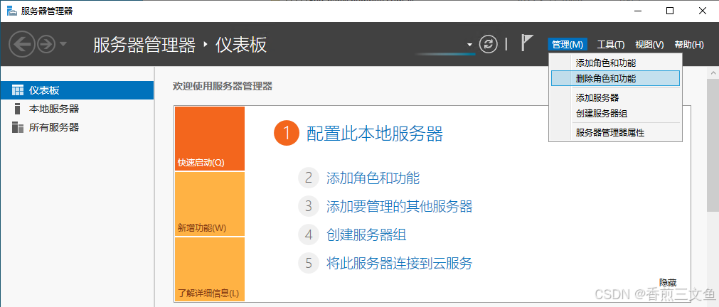 2.打开"服务器管理器",并依次选择"管理 > 删除角色和功能",单击"下一步 "。