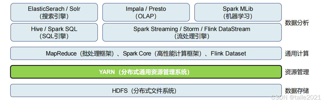 Yarn是一个分布式的通用资源管理系统,它处在整个大数据架构的中间位置,不仅可以把MapReduce的作业调度到HDFS上运行,也可以把我们spark/flink等作业任务都调度到HDFS上运行。
