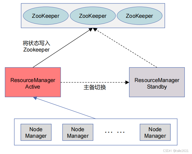 ResourceManager高可用指1个Active ResourceManager、多个Standby ResourceManager,宕机后自动实现主备切换。这些主节点之间的状态切换由ZooKeeper决定,ZooKeeper会从所有的主节点里面选取一个作为主节点,被选中的主节点状态就转换成Active,其他的就变成Standby。如果Active挂掉之后,由ZooKeeper把这个Active主节点的状态降成Standby,再从其他的Standby里选一个作为管理节点,把状态升为Active。 状态切换过来后,还要把元数据同步过来。在Yarn里,元数据直接放在ZooKeeper里, Standby可以从ZooKeeper里把元数据拿过来,同步元数据之后,再由ZooKeeper把状态切换成Active,就可以进行集群管理了。这里ZooKeeper充当了两个作用,第一负责状态切换,第二是存储元数据。
