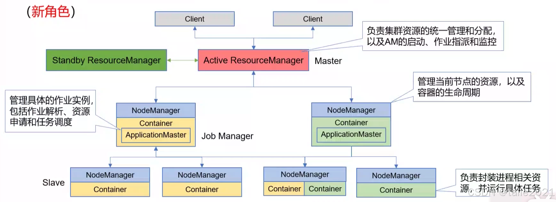 Yarn是很典型的主从架构,主节点是Resource Manager,从节点是Node Manager。一般会有热备节点解决单点架构问题。当前活跃的管理节点是active,热备节点是standby。