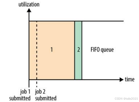 先进先出调度策略是将所有任务放入一个队列,先进的队列先获得资源,排在后面的任务只能等待前面的任务执行完。下面这张图可以看到,一开始先是提交了job1,job1就拿到整个集群的所有的资源。在虚线处job2也提交上来了,但它不能立马获取到资源,只能排在job1后面,等job1运行完成之后,job2才可以开始运行。这种先进先出的调度策略实现原理很简单,但它资源利用率低,无法交叉运行任务,对一些紧急的小任务非常不友好,紧急任务无法插队。