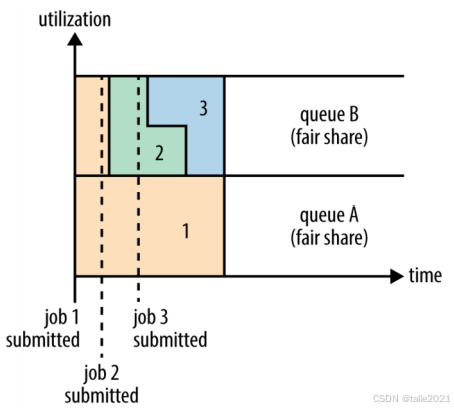 下图集群里分了两个队列,队列A和队列B,这两个队列之间并没有预先设定一个资源占比,他俩之间用公平的方式分配资源,见面分一半叫公平。比方在最开始时刻job1提交到队列A里面,提交进来之后发现整个集群的资源都是空闲的,于是job1把整个集群的资源都占用了,拿到集群百分之百的资源。在虚线处job2提交进来了,job2在提交到执行的过程中有一段空余时间,这段空余时间就给到job1让出一半资源来给到job2,job2拿到50%的资源就开始运行。默认情况下,队列和队列之间以公平的形式分配资源,何为公平,就是见面分一半。队列内部默认情况下也是公平去分配资源, job2运行的时候,job3提交到了同一个队列之后, job3在提交到执行的过程中有一段空余时间,这段空余时间就给到job2让出一半资源来给到job3,job3拿到队列内部50%的资源就开始运行了。