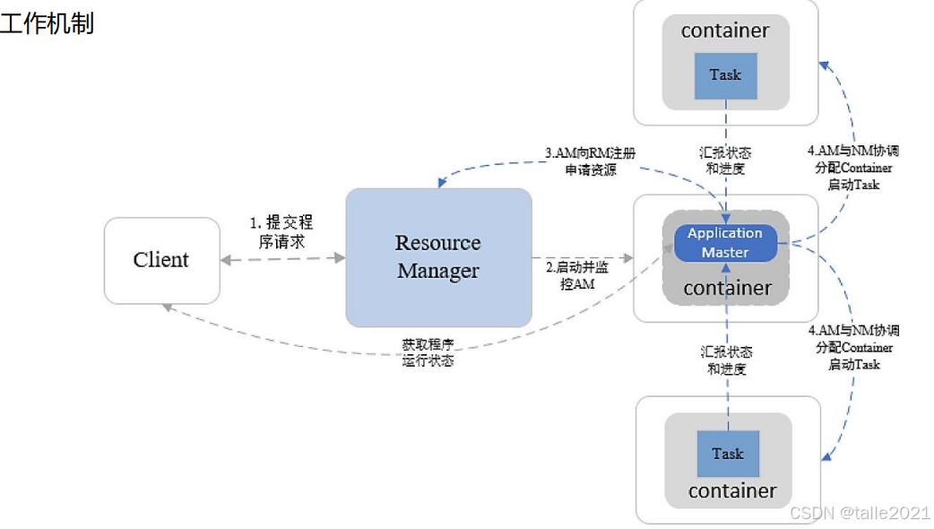 客户端向Resource Manager提交了一个作业上来, resource manager会在所有的Node Manager从节点里给提交上来的作业分配资源,分配到的资源包括所需要的CPU、内存、环境变量等都封装到container里,一般第一次提交上来的作业会分配一个container用来运行作业。第一个container分配出来之后,在第一个container里,作业先是把自己的作业管理进程ApplicationMaster运行起来,运行起来之后,才开始进行作业的具体解析。当解析后发现当前作业运行时需要额外的三个资源,于是ApplicationMaster再向Resource Manager申请资源,Resource Manager就会在所有Node Manager里面又找到三个资源分装成container并给到ApplicationMaster,ApplicationMaster拿到资源后,就把作业解析成多个task并分发到container里运行, 这些task在运行过程中实时向ApplicationMaster汇报,如果某个task挂掉了,ApplicationMaster会尝试着去重启。ApplicationMaster发现所有的task都运行完了再向Resource Manager申请释放资源,Resource Manager就把几个container释放掉。