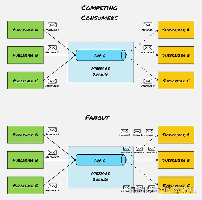 - 广播 / 扇出(Fanout):同一条消息会被多个订阅者分别消费,适合同步事件到多个下游系统