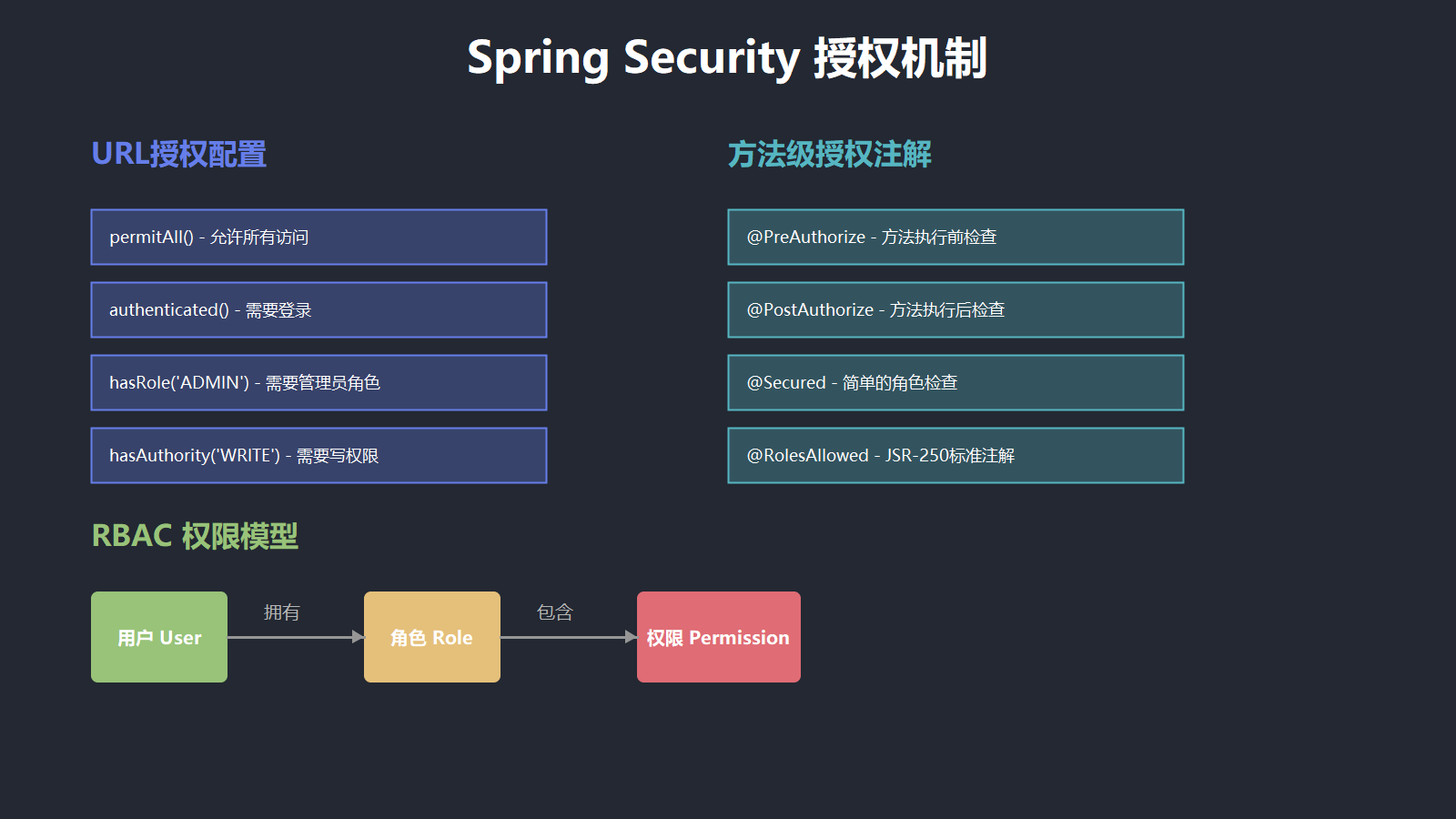 授权是指确定用户是否有权访问特定资源的过程。Spring Security支持多种授权方式。