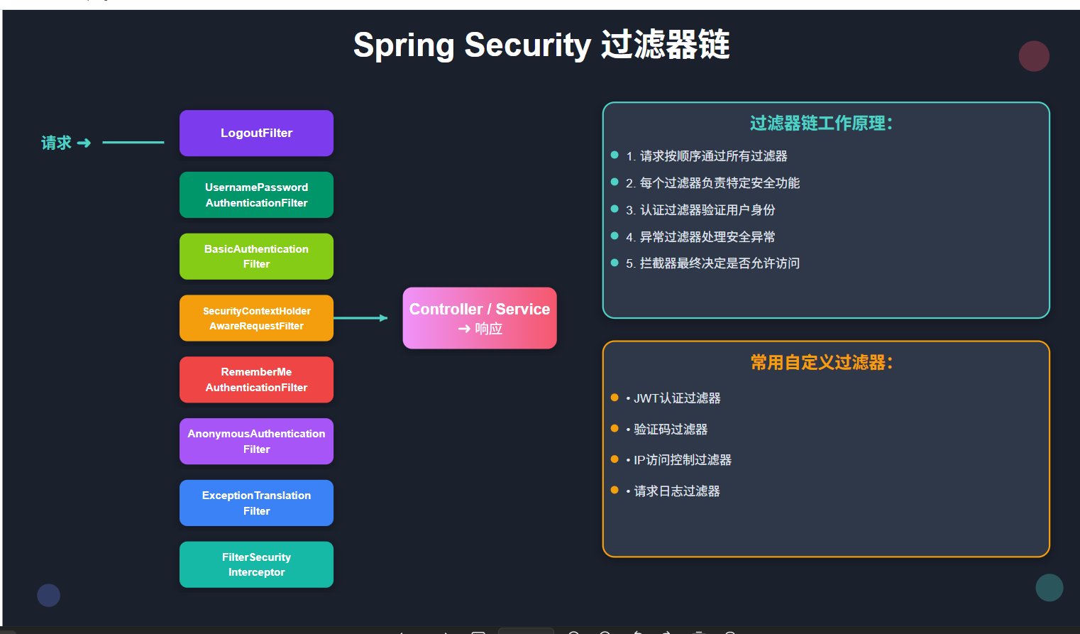 Spring Security通过过滤器链处理所有HTTP请求,理解过滤器链的工作原理对定制安全功能至关重要。
