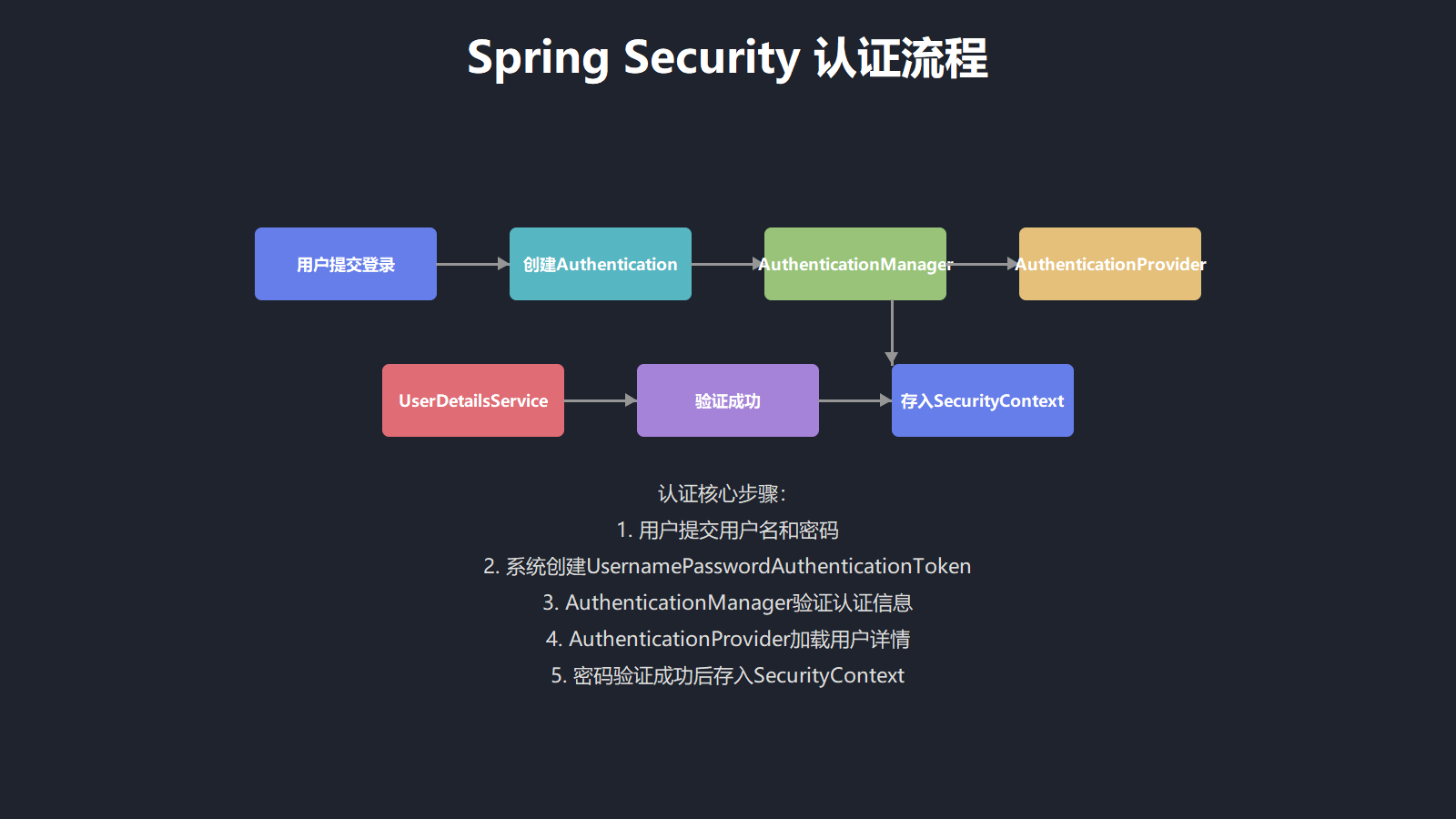 Spring Security的认证流程是一个精心设计的链式处理过程: