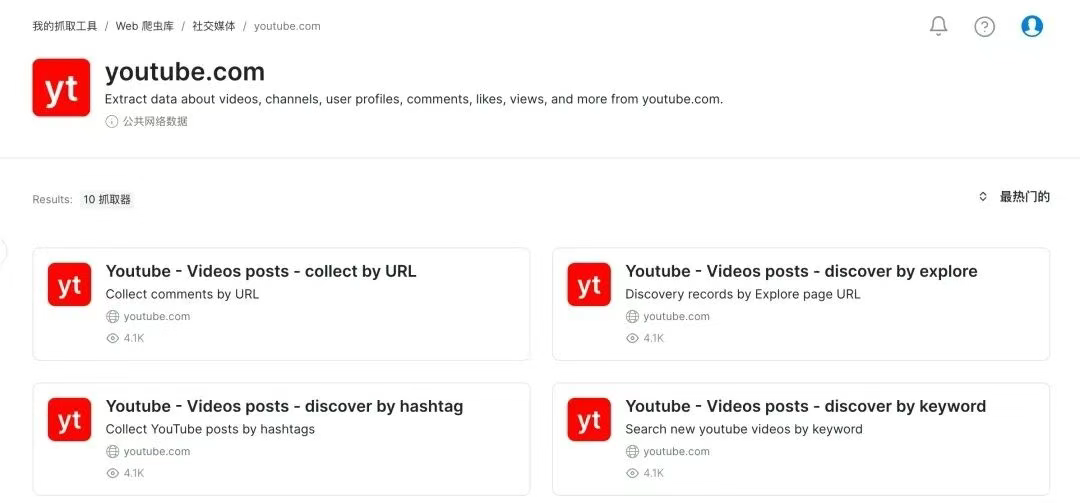 如果是搭建平台级采集应用,可以尝试亮数据网页抓取API,也能搭配yt-dlp一起用,它类似封装好的数据采集流水线,能自动处理各种反爬技术,它内置了专门用于Youtube等各大网站的网页抓取API,能直接通过requests访问并获取相应的视频、评论、互动等数据。