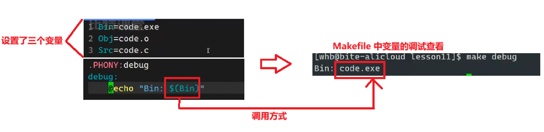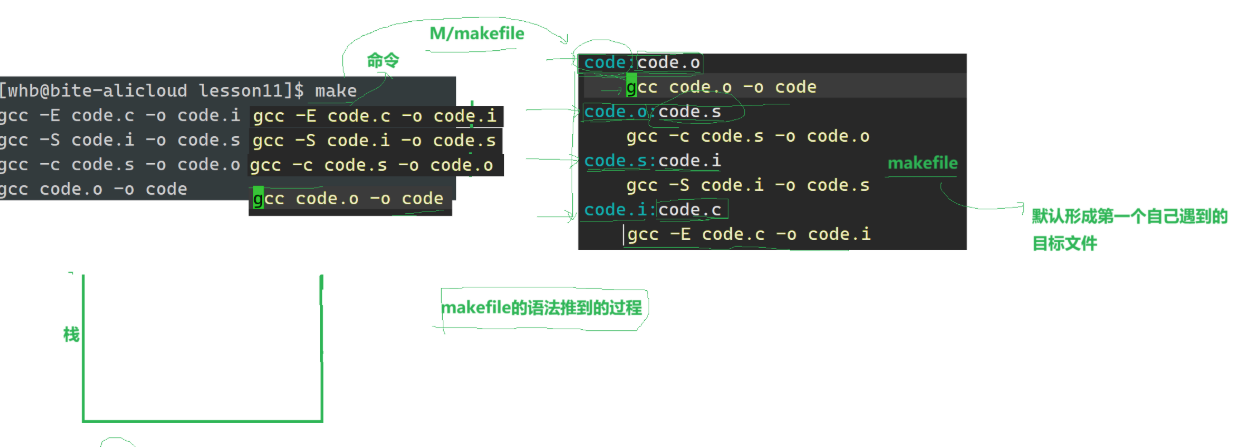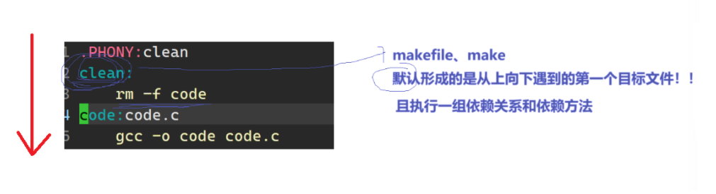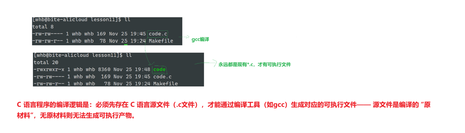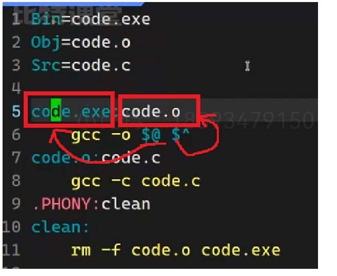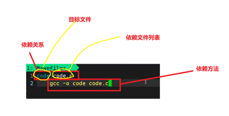 目标code依赖于源文件code.c,执行make命令时会自动调用gcc -o code code.c命令,将code.c编译为可执行文件code