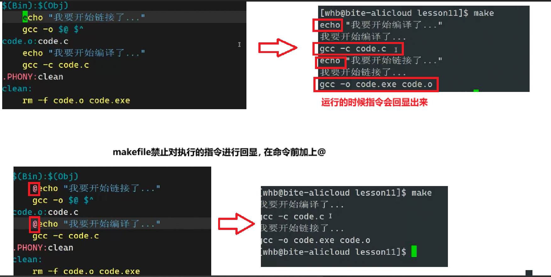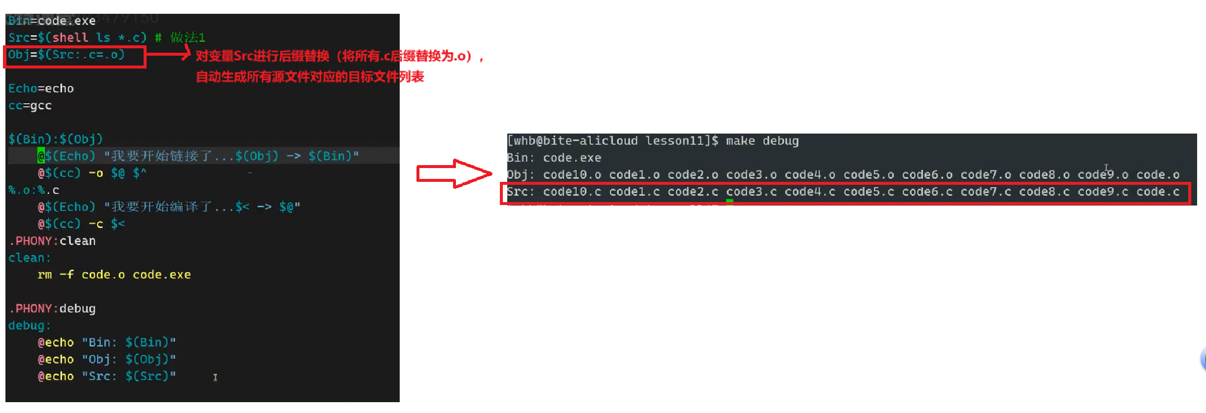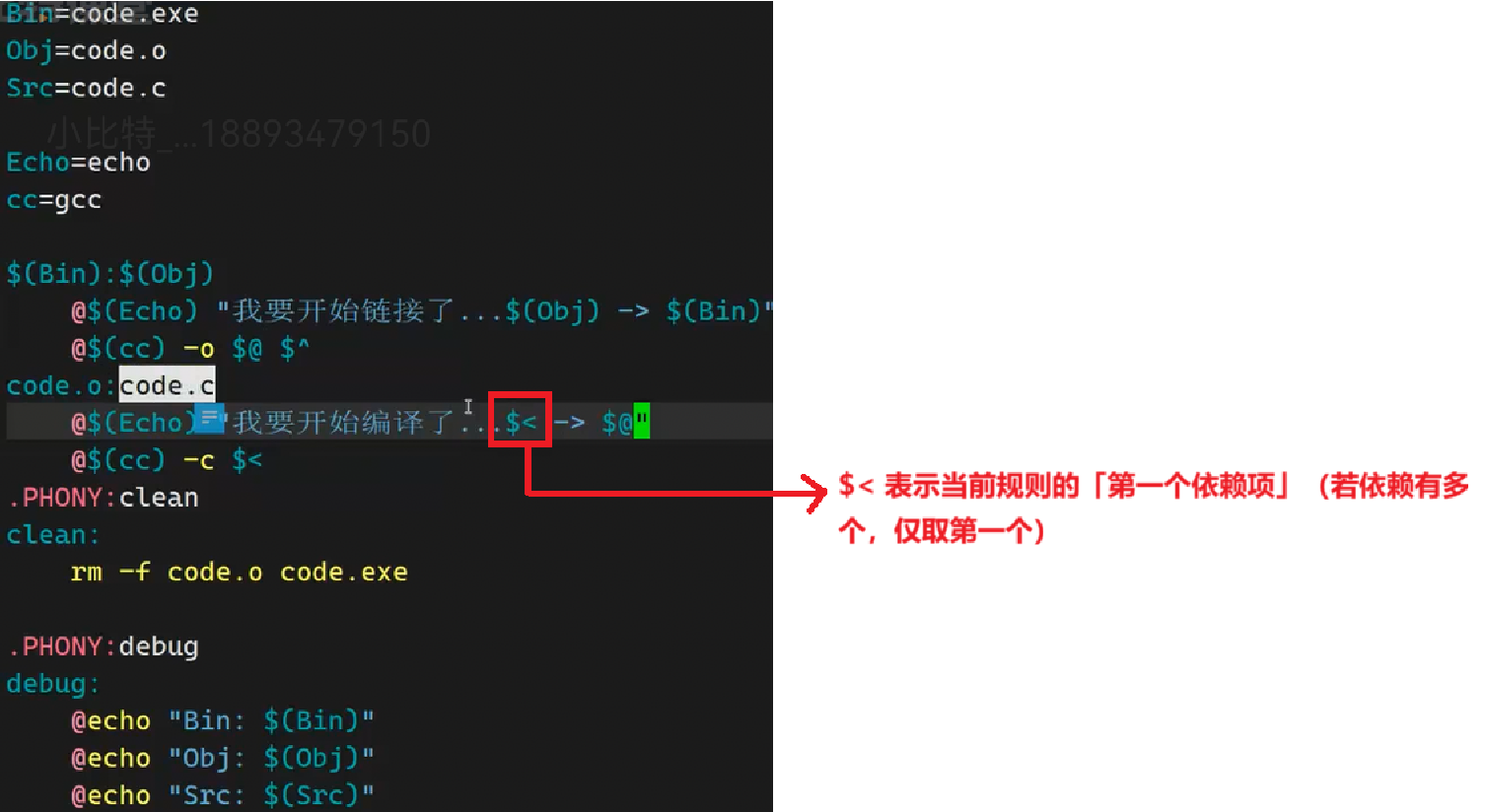 @(代表当前规则的 "目标",即code.exe)、^(代表当前规则的 "所有依赖",即code.o)
