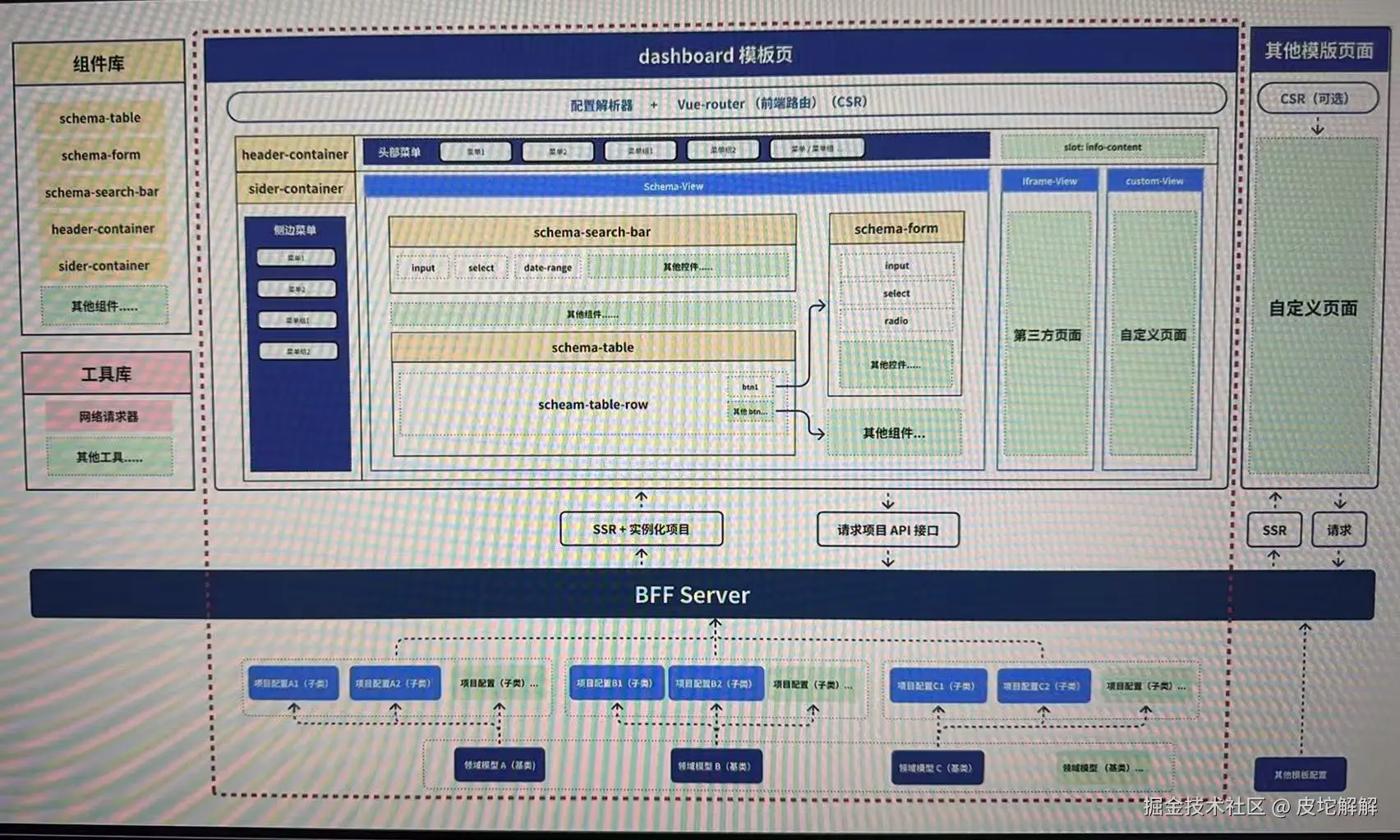 - 通过配置化快速搭建和沉淀大部分功能和组件(下图黄色和蓝色部分)。