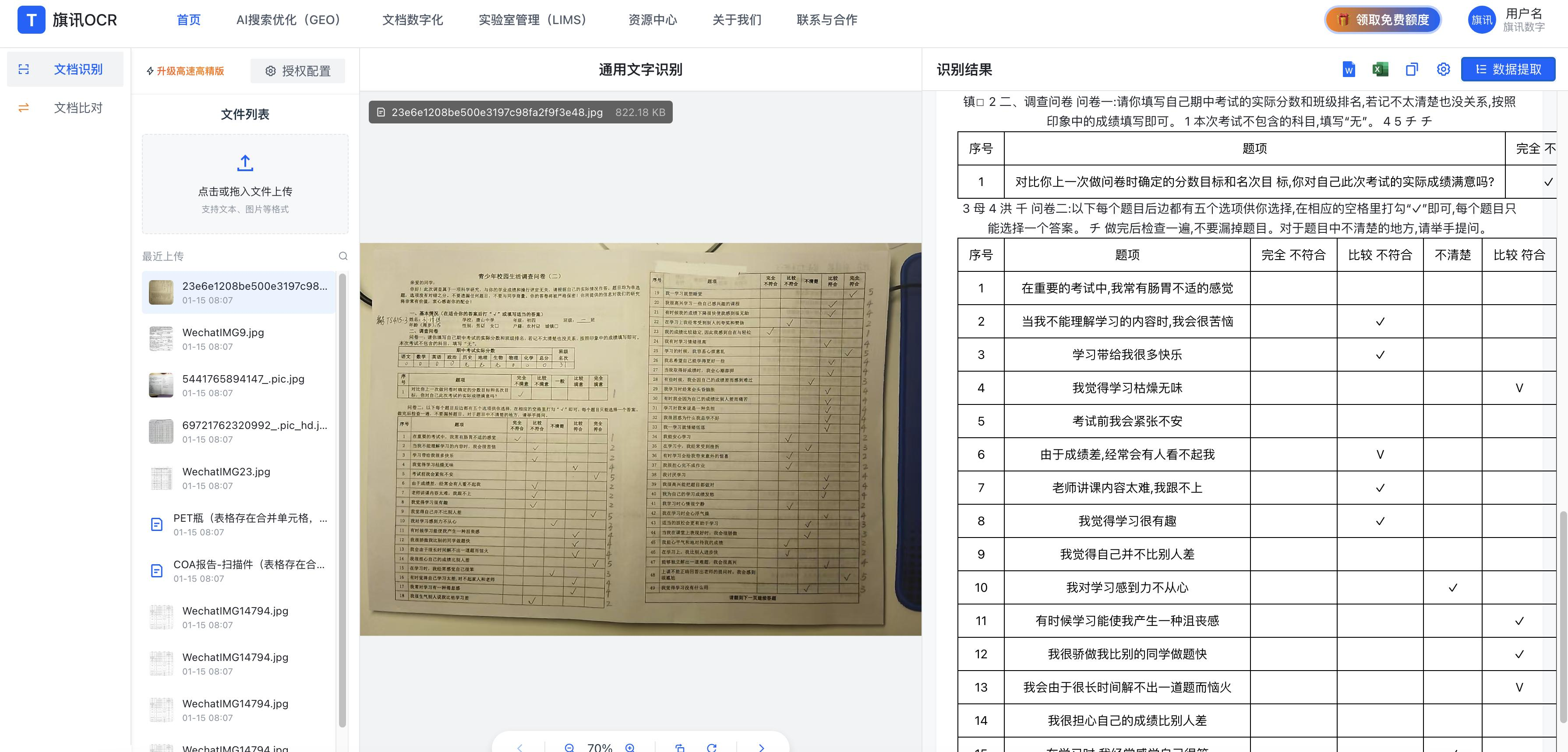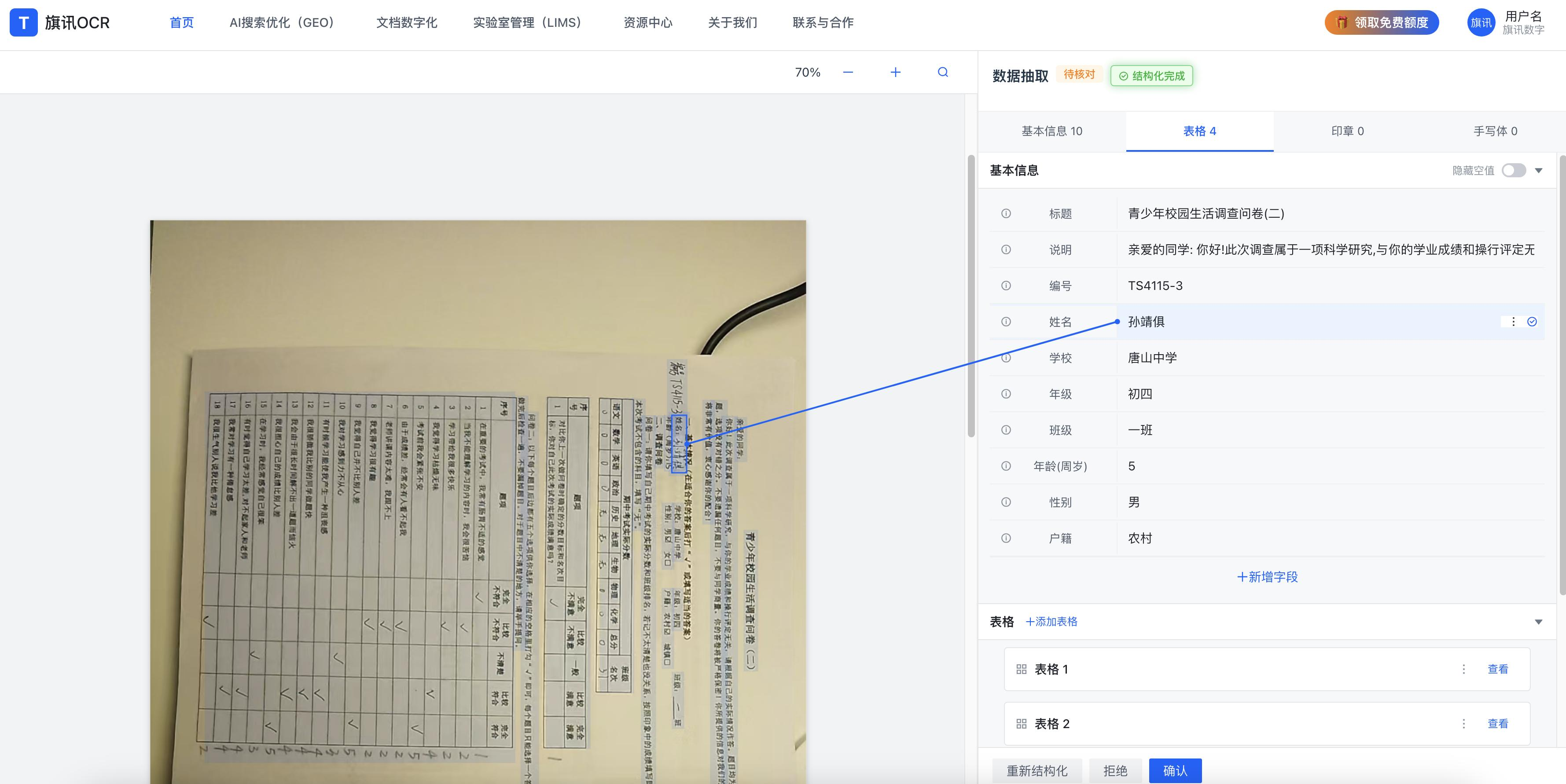人工复核:置信度低的内容自动高亮,支持对照原始问卷图片一键修正,复核效率比纯人工高70%。