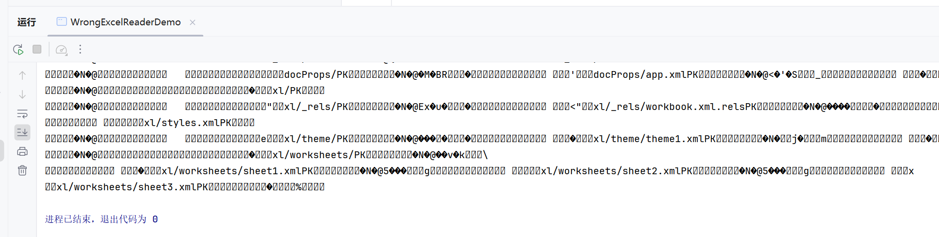 // 错误演示:用字符流读取Excel文件