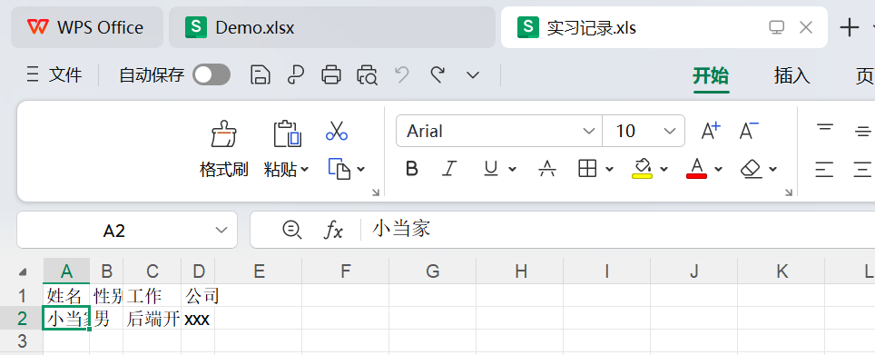 运行上述代码后,会在D盘根目录生成一个名为"实习记录.xls"的Excel文件: