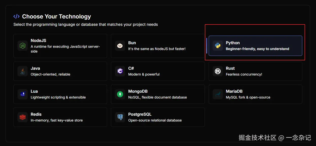 这里可以根据你实际所需选择运行环境,比如NodeJs、Java、Python、MongoDB、Redis等等都是可以的。 本次分享是以Python+Flask搭建网站为例进行分享的,所以我这里选择的是Python环境。