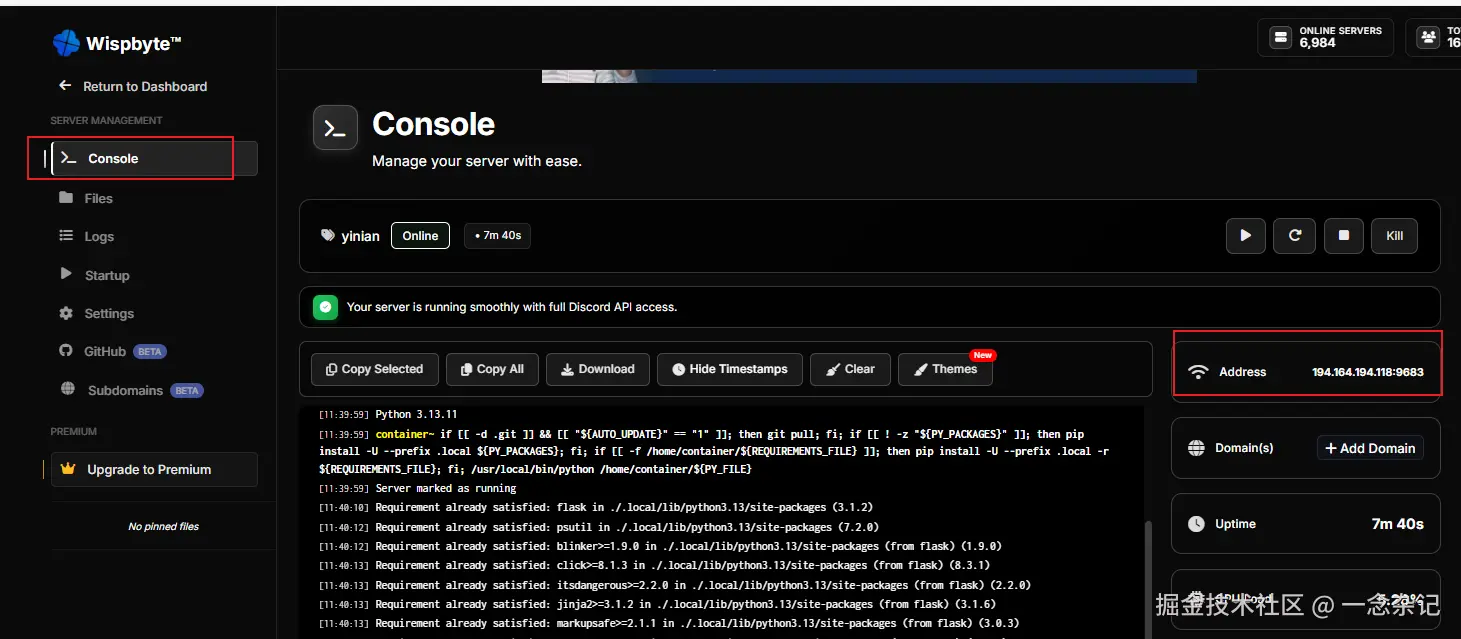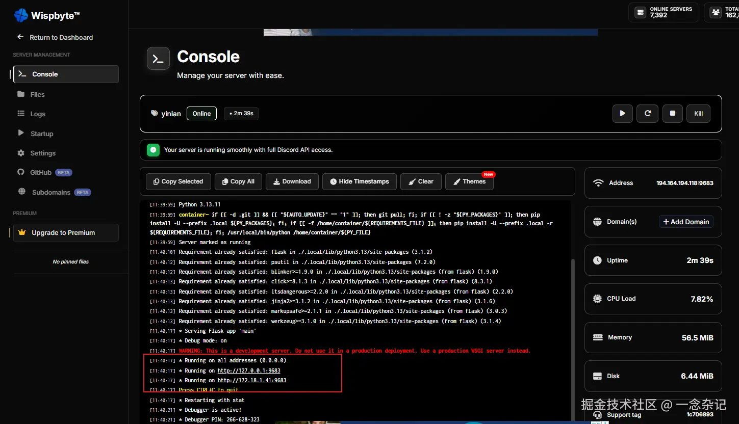 这里需要注意一点,Wispbyte免费服务器给我们分配了一个固定的端口,我们的服务必须基于这个端口进行,才能正常被访问到。