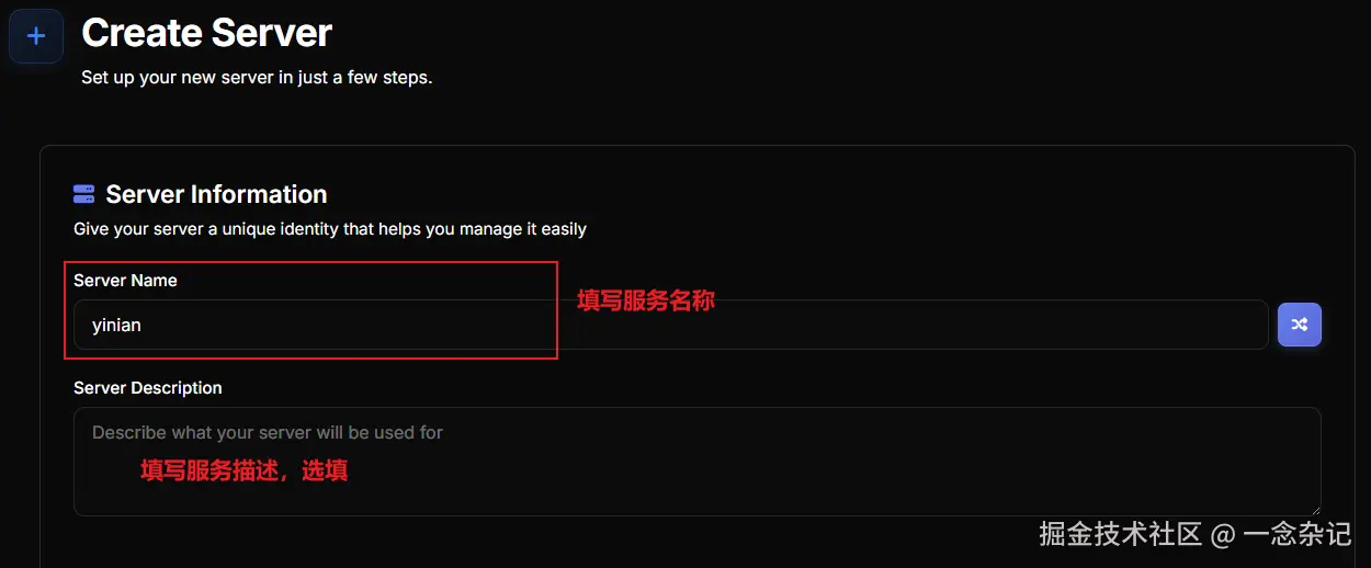 在Dashboard控制面板右侧会有一个Create Server的操作区,我们可以从这里开始创建我们想要的服务。