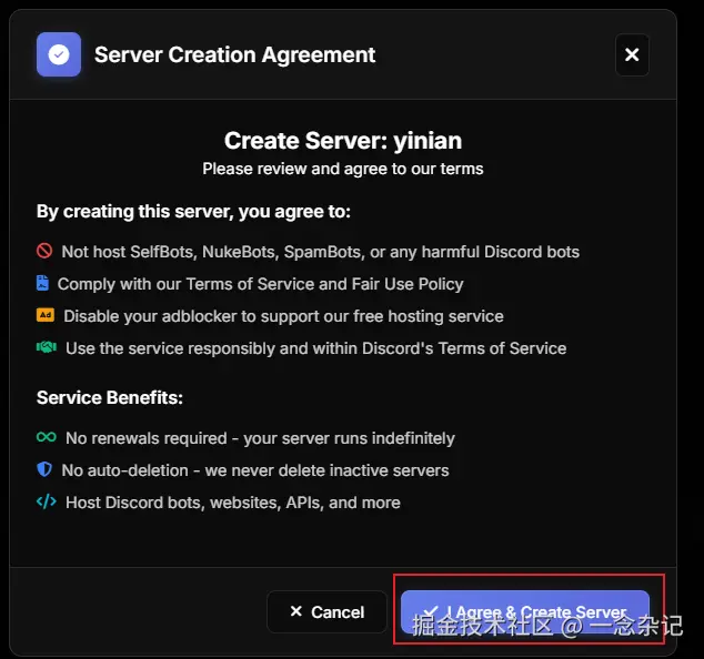 上述步骤完成之后,滚动到页面底部,点击"Create Server"按钮,点击同意创建即可完成服务创建 。