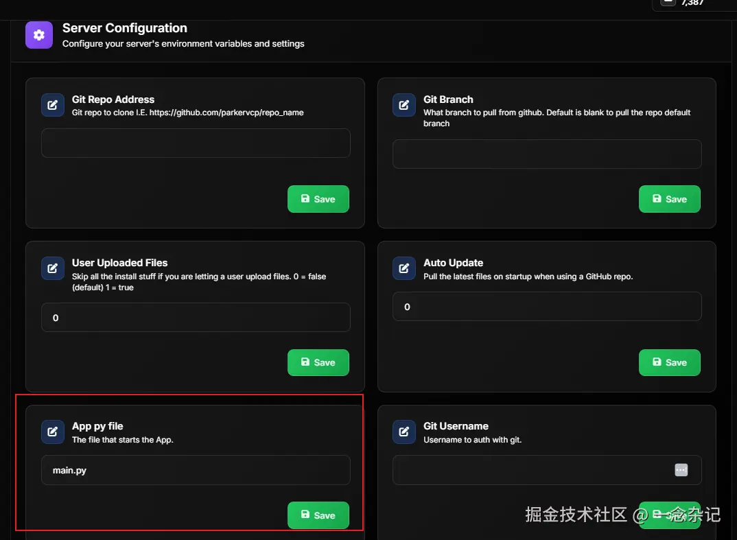 在页面下方还有一些服务配置功能可以快捷配置,这里我们先只配置我们的入口文件,输入我的入口文件main.py然后点击"Save"保存即可。