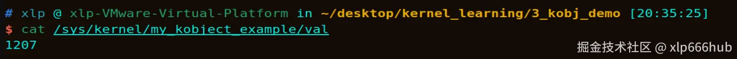 当我们执行 cat 时,终端输出了 1207,这说明内核成功调用了我们的 val_show 函数。