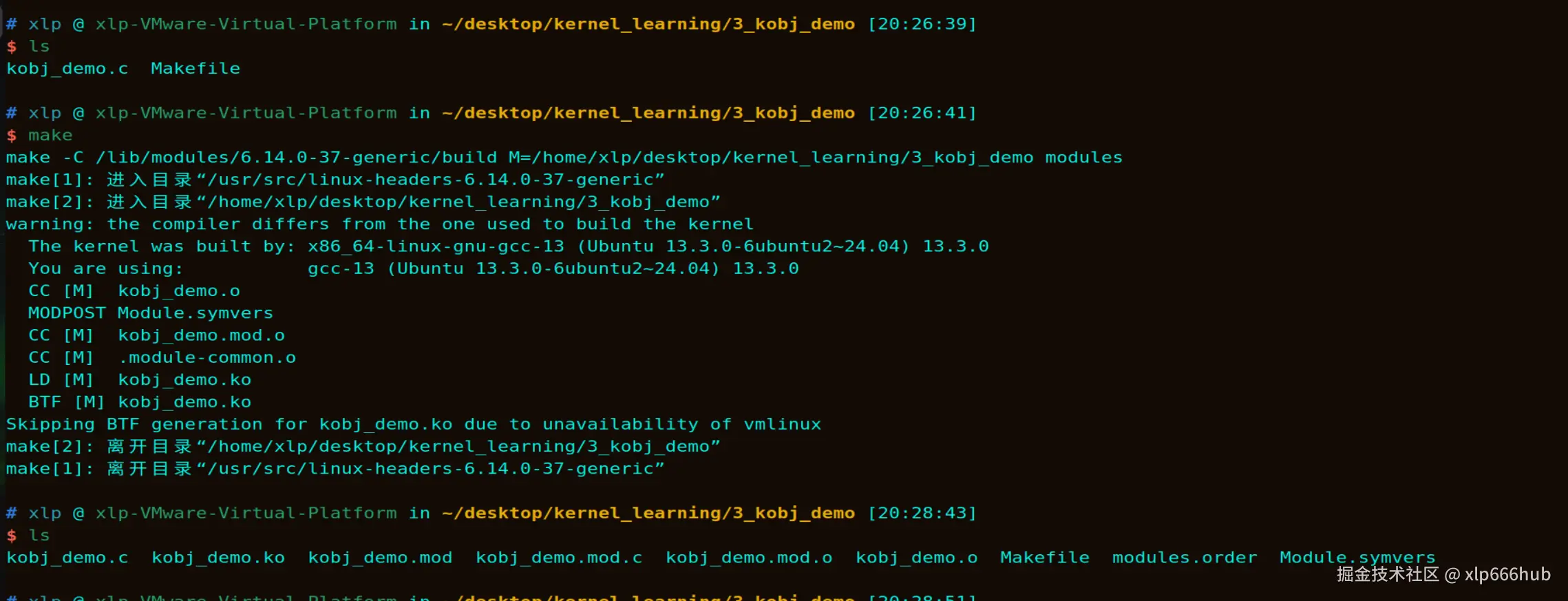 首先看第一行,obj-m表示要把后面的目标编译成内核模块 ,最终生成 .ko 文件。+=表示追加。还有目标文件的后缀是.o而不是.c,这是因为 Kbuild 会自动寻找同名的 .c 源文件,将其编译并链接。