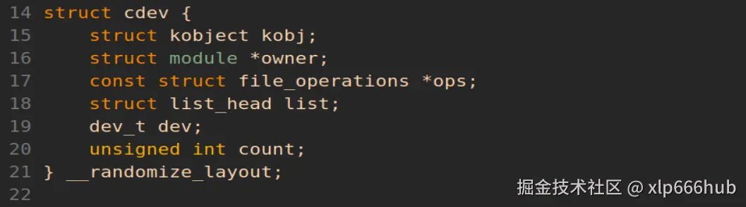 我们先来看字符设备结构体struct cdev,它存放在内核源码目录中的/include/linux/cdev.h文件中,我把截图放在下面: