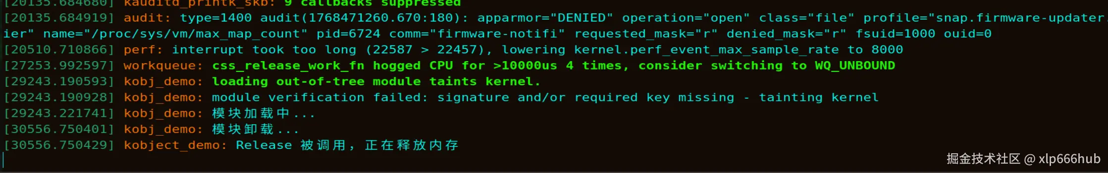 可以看到,日志中出现了我们程序中卸载模块时要打印的内容,并且由于只有我们在使用这个模块,引用次数为1,卸载之后调用kobject_put将引用次数减一,引用次数变为 0,然后内核调用了release函数,成功释放内存。