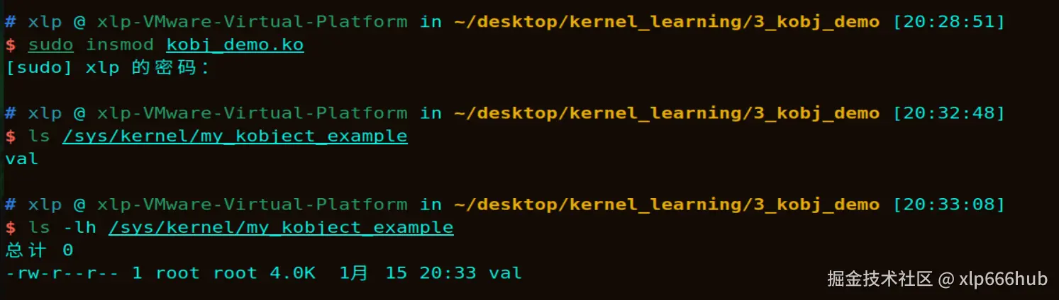 可以看到,/sys/kernel/ 下确实出现了一个名为 my_kobject_example 的目录,并且该目录下已经生成了我们的属性文件val,并且该属性文件的权限也和我们在程序中配置的一模一样。