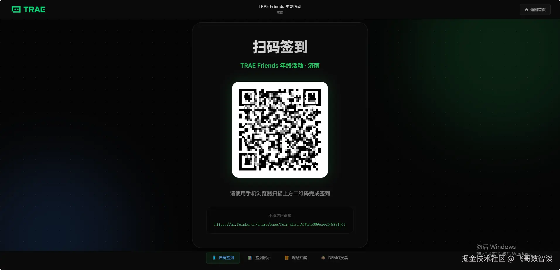 上周六举办了 TRAE Friends@济南 的活动,为了更好地支持现场,我用 TRAE 搭了个活动平台,实现活动信息查看、扫码签到、在线抽奖、Demo展示和投票等功能。