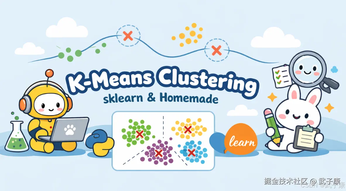 - 结论:自写版重点在数据形状与标签列约定;sklearn 重点在 n_clusters 选择、收敛与版本参数兼容(algorithm='auto' 风险)。