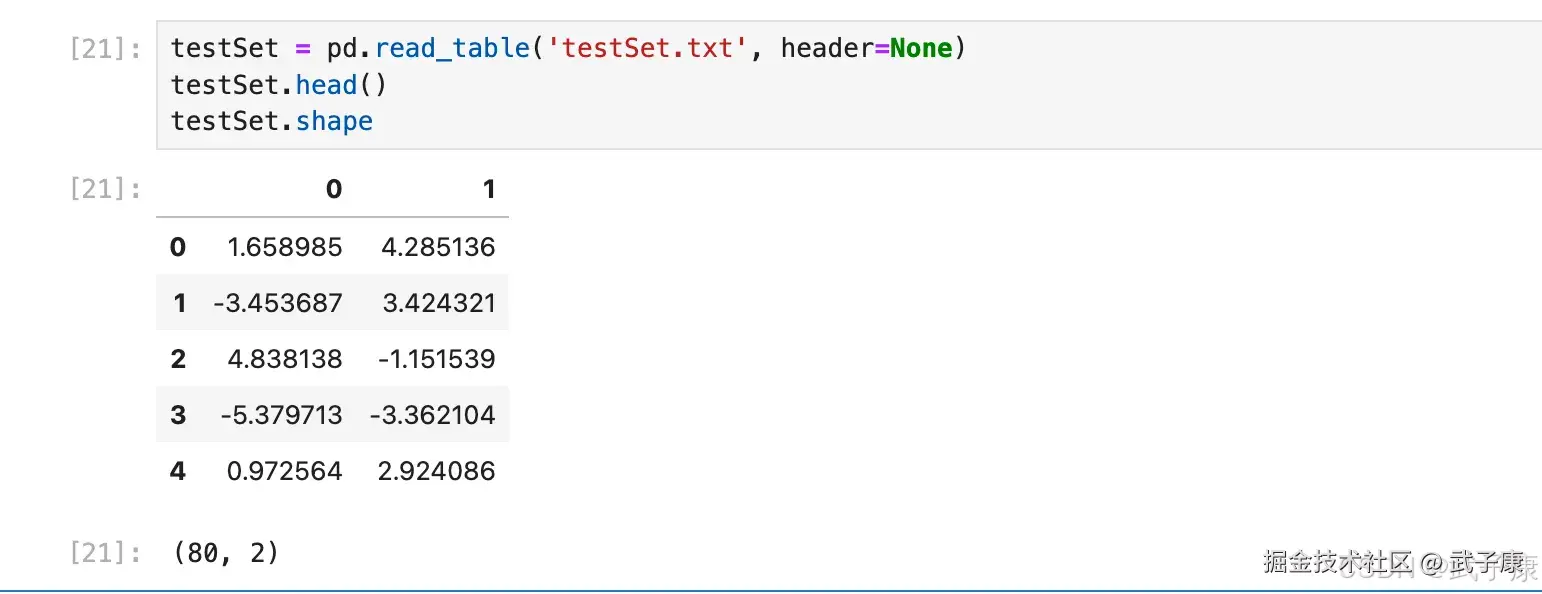 函数编写完成后,先以 testSet 数据集测试模型运行效果(为了可以直观看出聚类效果,此处采用一个二维数据集进行验证)。testSet 数据集是一个二维数据集,每个观测值都只有两个特征,且数据之间采用空格进行分隔,因此可以使用 pd.read_table() 函数进行读取。