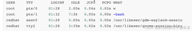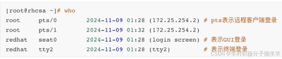 root pts/0.. :# pts表示远程客户端登录