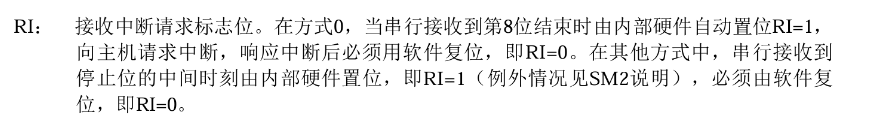 RI 位(接收中断标志位),用来查询8位数据是否接收完毕,接收完毕后会自动置1;必须用软件清0