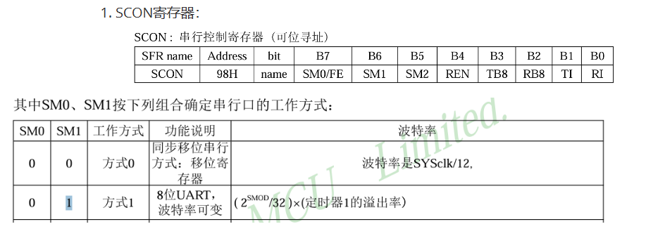2、再将SCON寄存器中的bit6置1,代表串口工作在8位UART,波特率可变模式