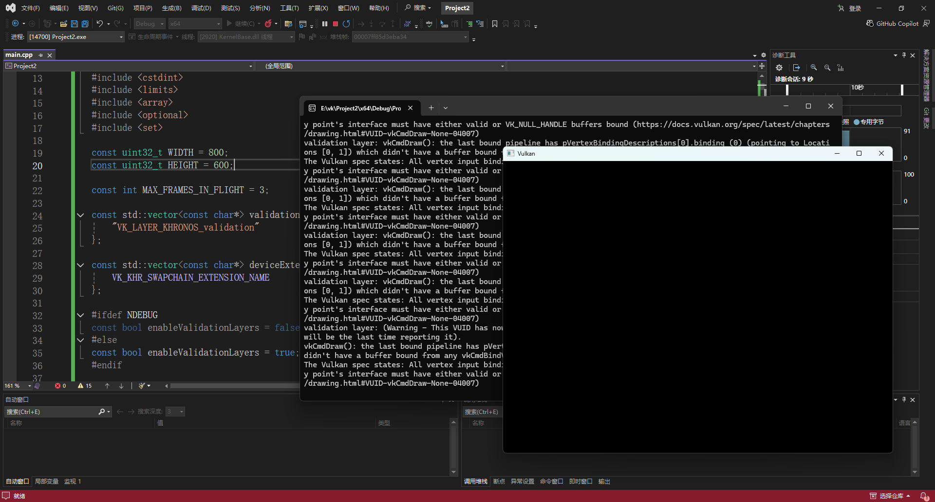 但是,如果你现在运行程序,屏幕上什么都不会显示(或者是黑屏)。为什么?因为管线虽然知道数据格式,但它还没有真正拿到数据 。我们还没有创建 GPU 显存(Vertex Buffer),也没有把 vertices 数组里的数据传上去。