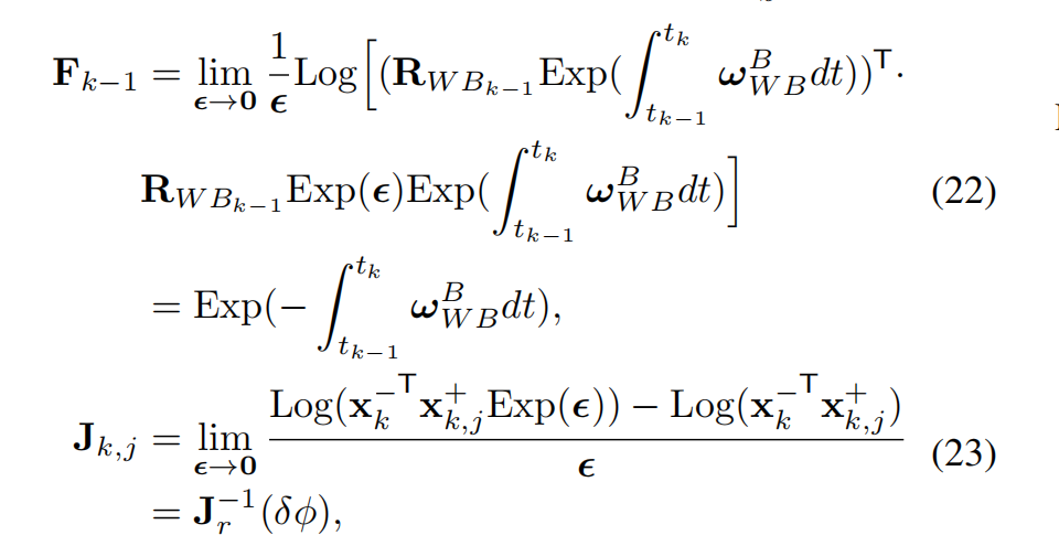 J k , j = lim ϵ → 0 L o g ( E x p ( ϵ ) x k , j + ( x k − ) T ) − L o g ( x k , j + ( x k − ) T ) ϵ = J l − 1 ( δ ϕ ) , (28) J_{k,j} = \lim_{\epsilon \to 0} \frac{\mathrm{Log}(\mathrm{Exp}(\epsilon) x^+_{k,j} (x^-k)^T) - \mathrm{Log}(x^+{k,j} (x^-k)^T)}{\epsilon} \\= J_l^{-1}(\delta \phi), \tag{28} Jk,j=ϵ→0limϵLog(Exp(ϵ)xk,j+(xk−)T)−Log(xk,j+(xk−)T)=Jl−1(δϕ),(28)
