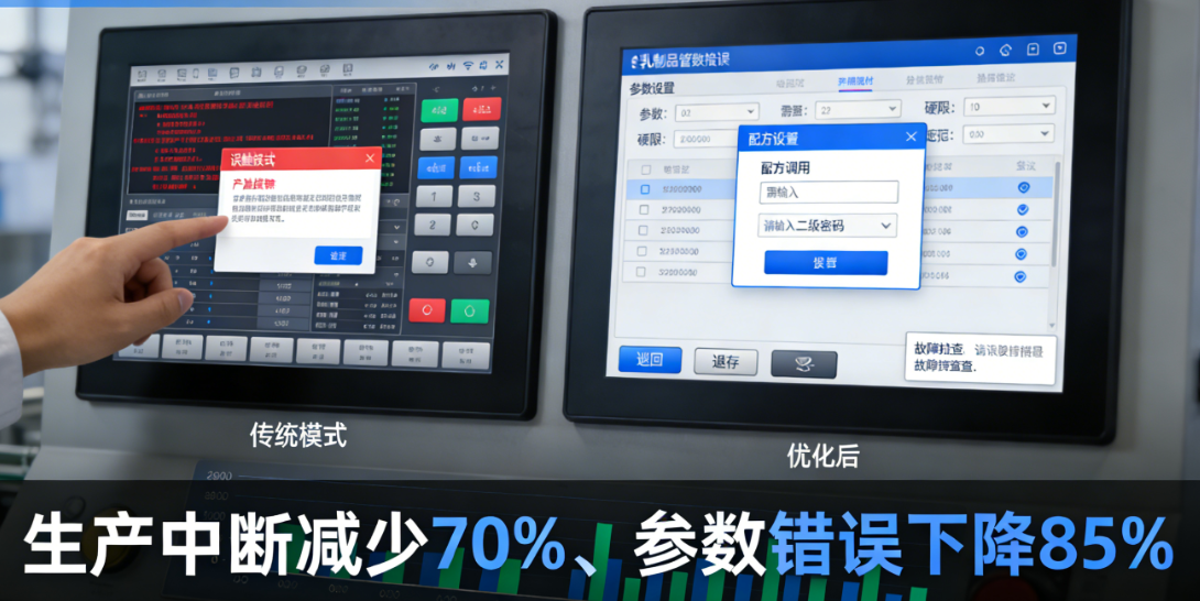 实施全面容错设计后:为配方调用设置了二级密码和确认摘要。所有温度、压力参数输入框设置了硬性上下限和实时提示。增加了"撤销上次设置"按钮和"保存当前状态"功能。任何设备启停失败都会给出带排查建议的详细提示。