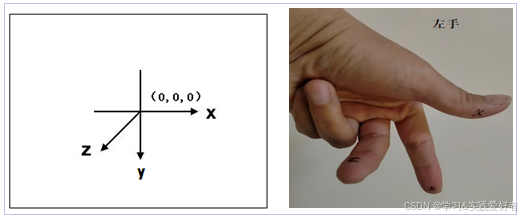 3D 模式下,p5.js 的原点 (0,0,0) 在画布的最中心(而不是左上角),x轴右+左-,y轴下+上-,z轴前(出屏幕)+后- 。坐标系类型是左手 Y-Down【注意:"手性"(Chirality)可以用来帮助确定三个轴之间的相对关系,大拇指(x)、食指(y)、中指(z),而不是确定轴在这个世界里的绝对朝向。关于手性的更多情况,可参见 https://blog.csdn.net/cnds123/article/details/156716324 一文的有关部分】。