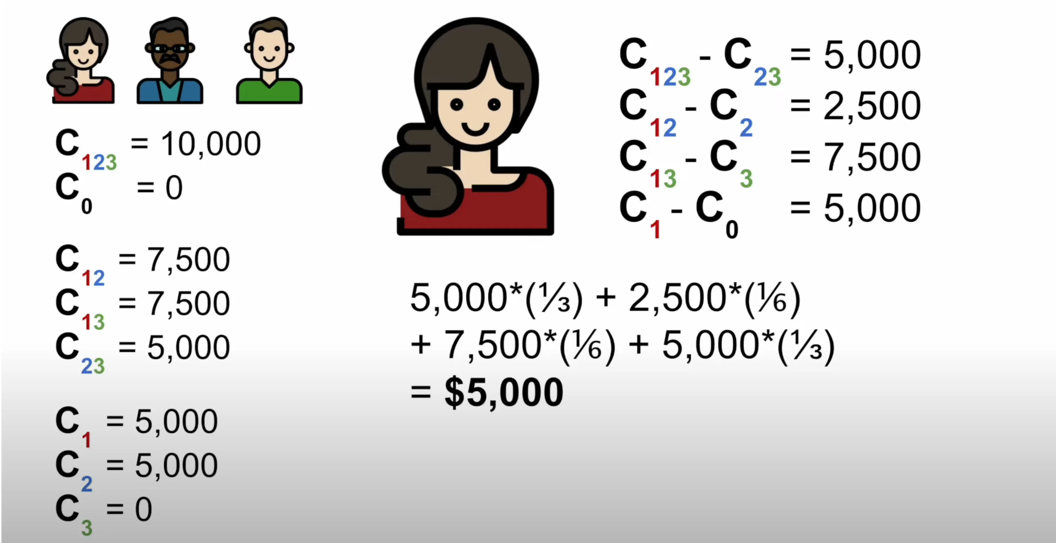 ϕ 1 = 0 ! ⋅ 2 ! 3 ! [ C 1 − C 0 ] + 1 ! ⋅ 1 ! 3 ! [ C 12 − C 2 ] + 1 ! ⋅ 1 ! 3 ! [ C 13 − C 3 ] + 2 ! ⋅ 0 ! 3 ! [ C 123 − C 23 ] = 1 3 [ 5000 − 0 ] + 1 6 [ 7500 − 5000 ] + 1 6 [ 7500 − 0 ] + 1 3 [ 10000 − 5000 ] = 5000 3 + 2500 6 + 7500 6 + 5000 3 = 10000 3 + 10000 6 = 20000 + 10000 6 = 30000 6 = 5000 \begin{aligned} \phi_1 &= \frac{0! \cdot 2!}{3!}[C_1 - C_0] + \frac{1! \cdot 1!}{3!}[C_{12} - C_2] + \frac{1! \cdot 1!}{3!}[C_{13} - C_3] + \frac{2! \cdot 0!}{3!}[C_{123} - C_{23}] \\ &= \frac{1}{3}[5000 - 0] + \frac{1}{6}[7500 - 5000] + \frac{1}{6}[7500 - 0] + \frac{1}{3}[10000 - 5000]\\ &=\frac{5000}{3} + \frac{2500}{6} + \frac{7500}{6} + \frac{5000}{3} = \frac{10000}{3} + \frac{10000}{6} = \frac{20000 + 10000}{6} = \frac{30000}{6} \\ &= 5000 \end{aligned} ϕ1=3!0!⋅2![C1−C0]+3!1!⋅1![C12−C2]+3!1!⋅1![C13−C3]+3!2!⋅0![C123−C23]=31[5000−0]+61[7500−5000]+61[7500−0]+31[10000−5000]=35000+62500+67500+35000=310000+610000=620000+10000=630000=5000
