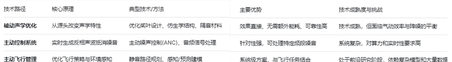无人机降噪主要通过"被动声学优化"、"主动控制系统"和"主动飞行管理"三种路径实现。下表汇总了主要技术路径及其核心原理: