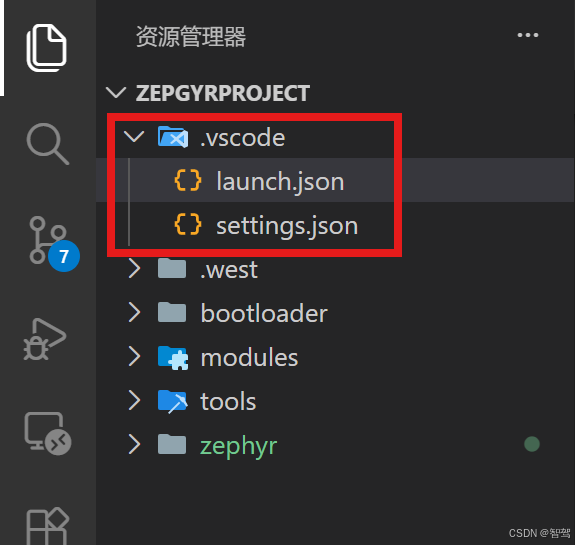 在当前Zephyr工程目录下,新建.vscode文件夹,在其中新建launch.json、settings.json文件,如下图: