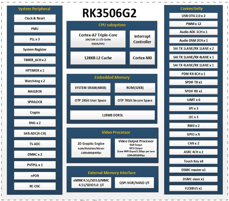 RK3506G 具有高性能的存储器接口,能够支持高要求的存储器带宽。RK3506G2集成128MB DDR3L。