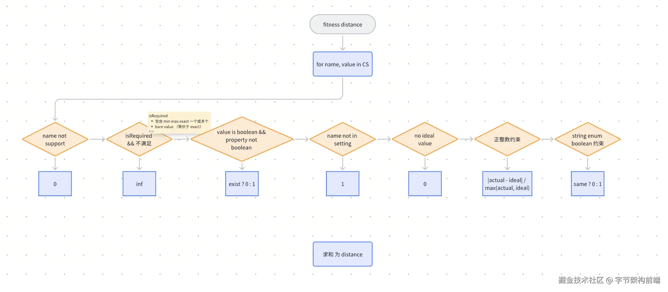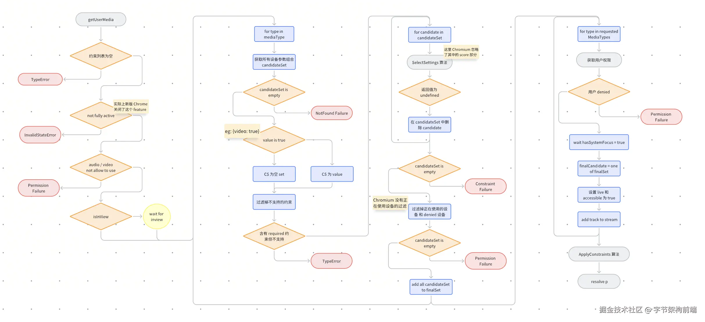 观察 ApplyConstraintSet 函数,这里基本上对应 W3C 草案中的 fitness_distance 的部分。可以发现其实 Chromium 完全没有参考草案中的流程。代码将约束分为四类:deviceId、groupId、number 与 boolean、processing_based。其中 processing_based 表示需要使用 WebRTC 模块提供的音频处理功能的约束。