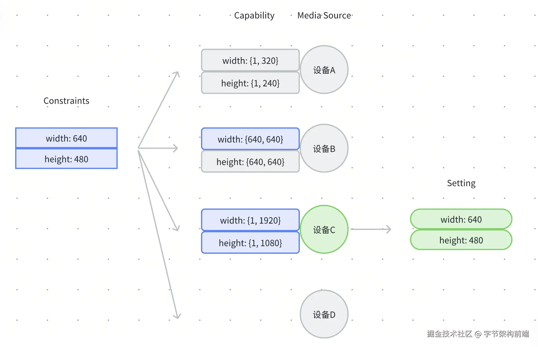 主要注意的是,传给 getUserMedia 接口的参数被称作"约束"。这是因为该接口最终返回的流可能与约束不一致。这就涉及到设置、能力与约束的区别了。