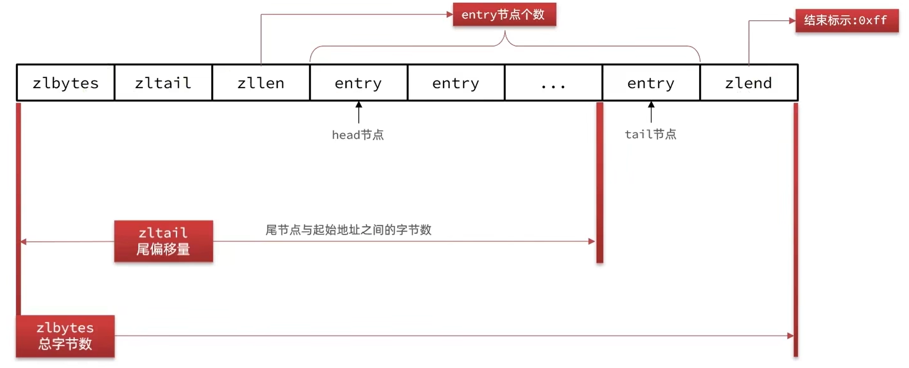 - 如果前一节点的长度大于等于254字节,则采用5个字节来保存这个长度值,第一个字节为0xfe,后四个字节才是真实长度数据