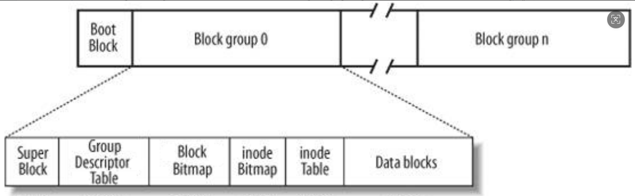 Linux ext2文件系统,上图为磁盘文件系统图(内核内存映像肯定有所不同),磁盘是典型的块设备,一块磁盘被分为几个区,每个分区被划分为一个个的block。一个block的大小是由格式化的时候确定的,并且不可以更改。例如mke2fs的-b选项可以设定block大小为1024、2048或4096字节。而上图中启动块(Boot Block)的大小是确定的。