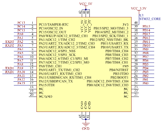 STM32F103C8T6单片机核心板接口电路图如下图所示。
